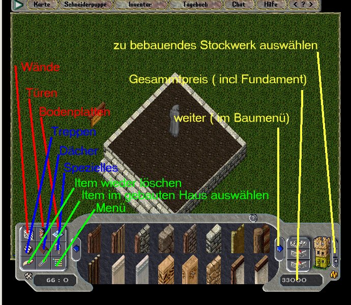 Nachdem du das Hauschild doppelgeklickt hast wähle die Option CUSTOMIZE , anschließend Customize this House. Du stehst nun, für alle anderen unsichtbar in deinem Haus, und ein Baumenü ist erschienen. Beachte bitte, das die anderen Player dich während dem Bau weder sehen noch hören können. Das Haus kannst du mit einem Linksklick wieder verlassen.